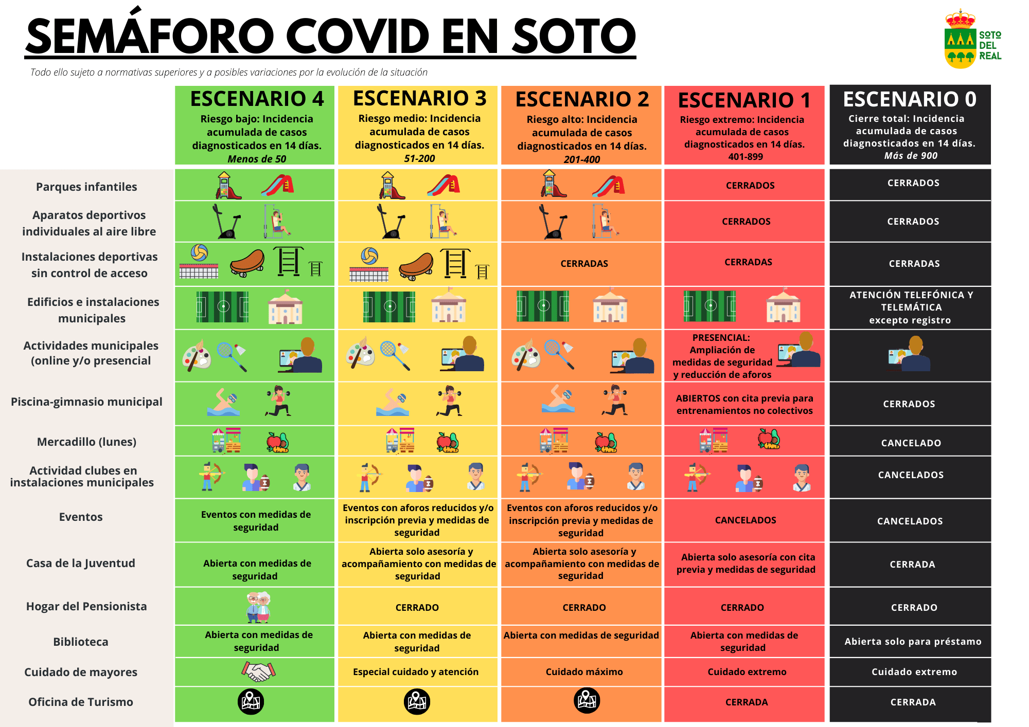 El Ayuntamiento de Soto del Real establece un sistema de medidas de protección frente al coronavirus basado en 5 escenarios en función de la tasa de incidencia acumulada en el municipio: