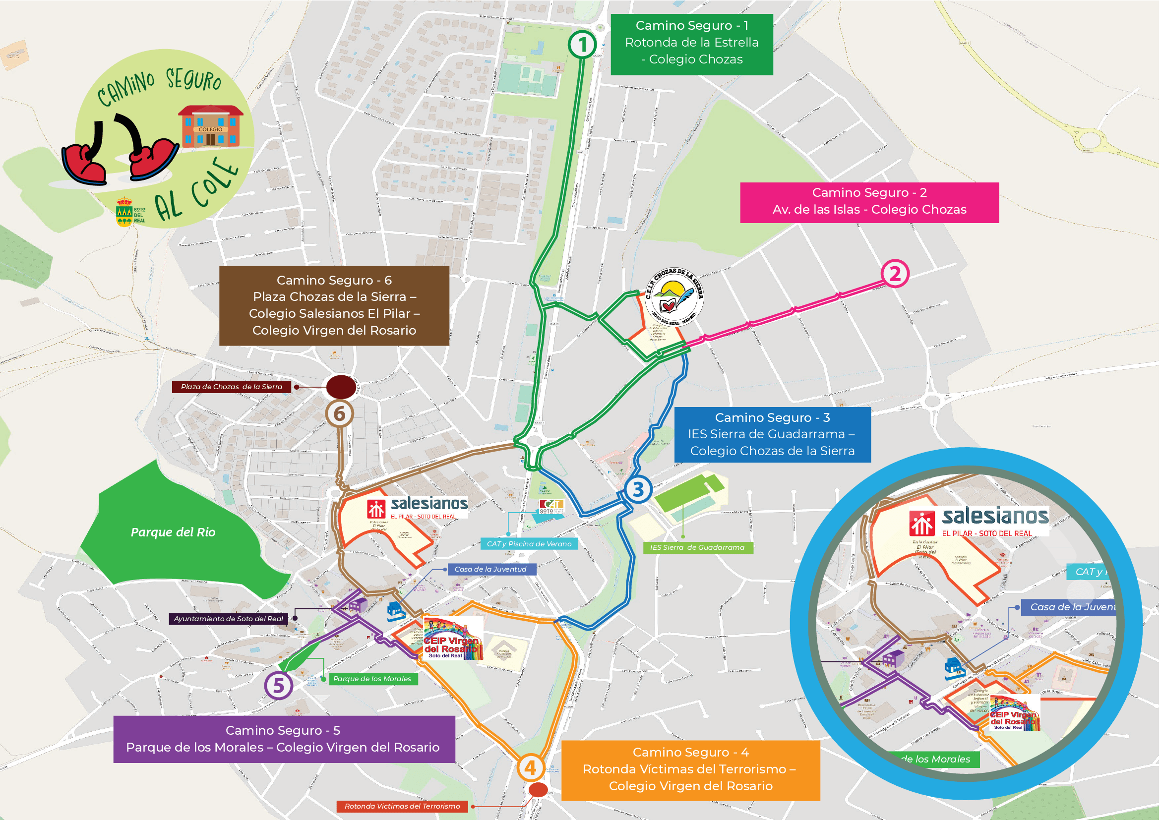 “Camino seguro al cole” es un proyecto que comenzó con encuestas en los centros educativos en las que los niños y niñas explicaron cómo iban al colegio, cómo les gustaría ir y dibujaron un mapa del recorrido que solían hacer. A partir de estos resultados se realizaron unos itinerarios para determinar los caminos más utilizados y, después de mantener reuniones con vecinos, una empresa experta en este tipo de proyectos y el personal del ayuntamiento, se creó un mapa con diferentes rutas para llegar a los tres colegios de Soto del Real (CEIP Chozas de la Sierra, Colegio Salesianos El Pilar y CEIP Virgen del Rosario) andando o en bicicleta.