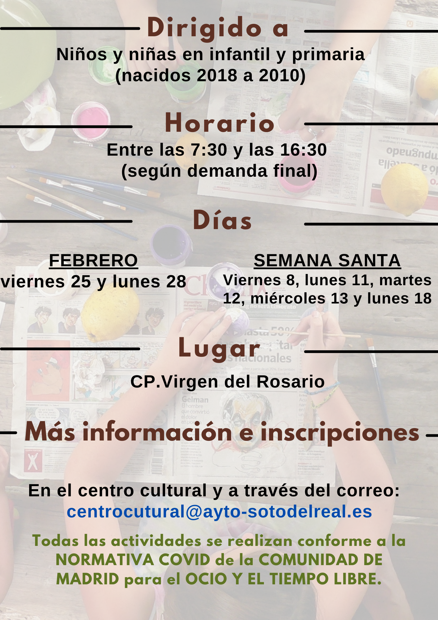 Las inscripciones  pueden ser descargadas aquí deben realizarse en el Centro Cultural o mediante el correo electrónico centrocultural@ayto-sotodelreal.es , pudiendo seleccionarse días sueltos o todos los días.