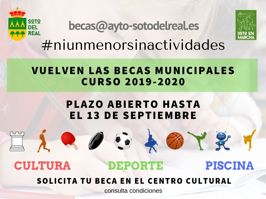 23 de julio de 2019. Soto del Real continúa un año más con su objetivo ‘Ni un menor sin actividades’. Hasta el 13 de septiembre, los vecinos empadronados en Soto pueden solicitar becas municipales para las actividades infantiles y juveniles de cultura, educación y deporte para el curso 2019-2020.