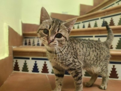 CARACTERÍSTICAS: Es bastante miedosa, pero con tiempo y paciencia se va dejando tocar, lo ha debido pasar muy mal en la calle. Se la recogió con una infección de las vías altas y el ojito bastante cerradito, pero en la foto se ve lo bien que está ahora.
