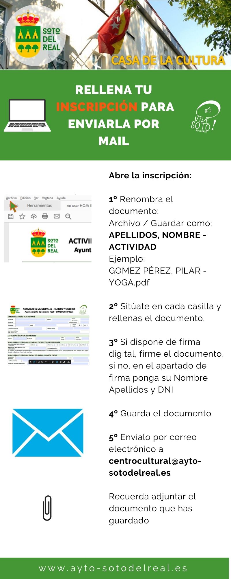 Procedimiento para realizar la reserva de plaza para el curso 2020-2021 de las actividades, Cursos y Talleres de las Áreas de Cultura, Educación y Deporte de Soto del Real.