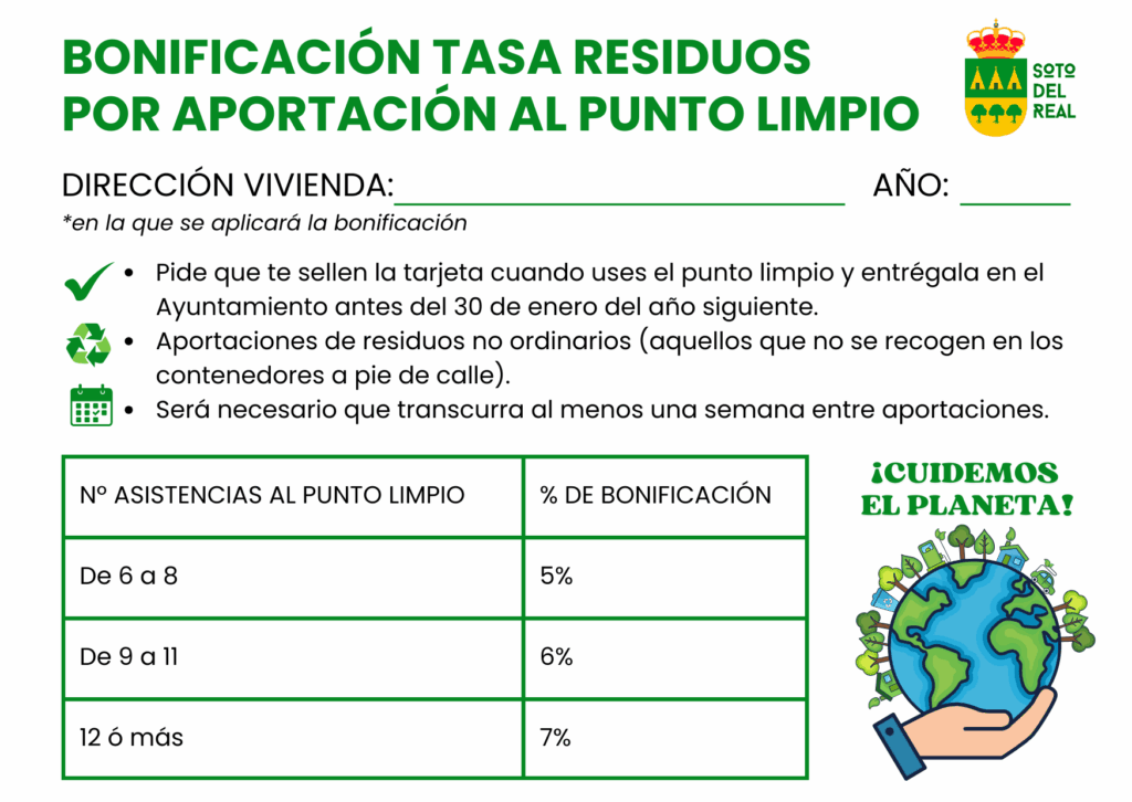 Sólo tienes que recoger la tarjeta en el Ayuntamiento. Pide que te sellen la tarjeta cuando uses el punto limpio y entrégala en el Ayuntamiento antes del 30 de enero del año siguiente. Podrás utilizarla con aportaciones de residuos no ordinarios (aquellos que no se recogen en los contenedores a pie de calle), y dejando que transcurra al menos una semana entre aportaciones.