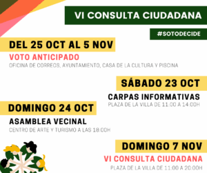 El domingo 24 de octubre por la tarde, a las 18:00h. en el Centro de Artes y Turismo (Avenida Victimas del Terrorismo, 2) tendrá lugar la Asamblea Vecinal en la que conoceremos los proyectos elaborados por los Consejos Sectoriales que se someterán a votación el 7 de noviembre.